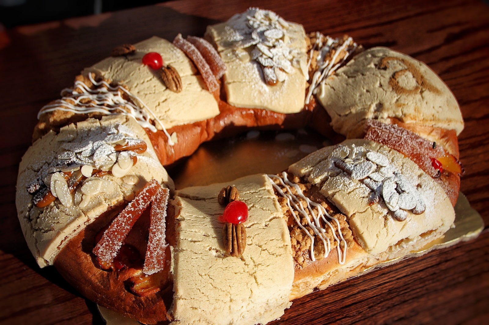 Rosca Tradicional con concha de vainilla, ate de guayaba azucarado, durazno y cerezas, dulce de leche y almendras